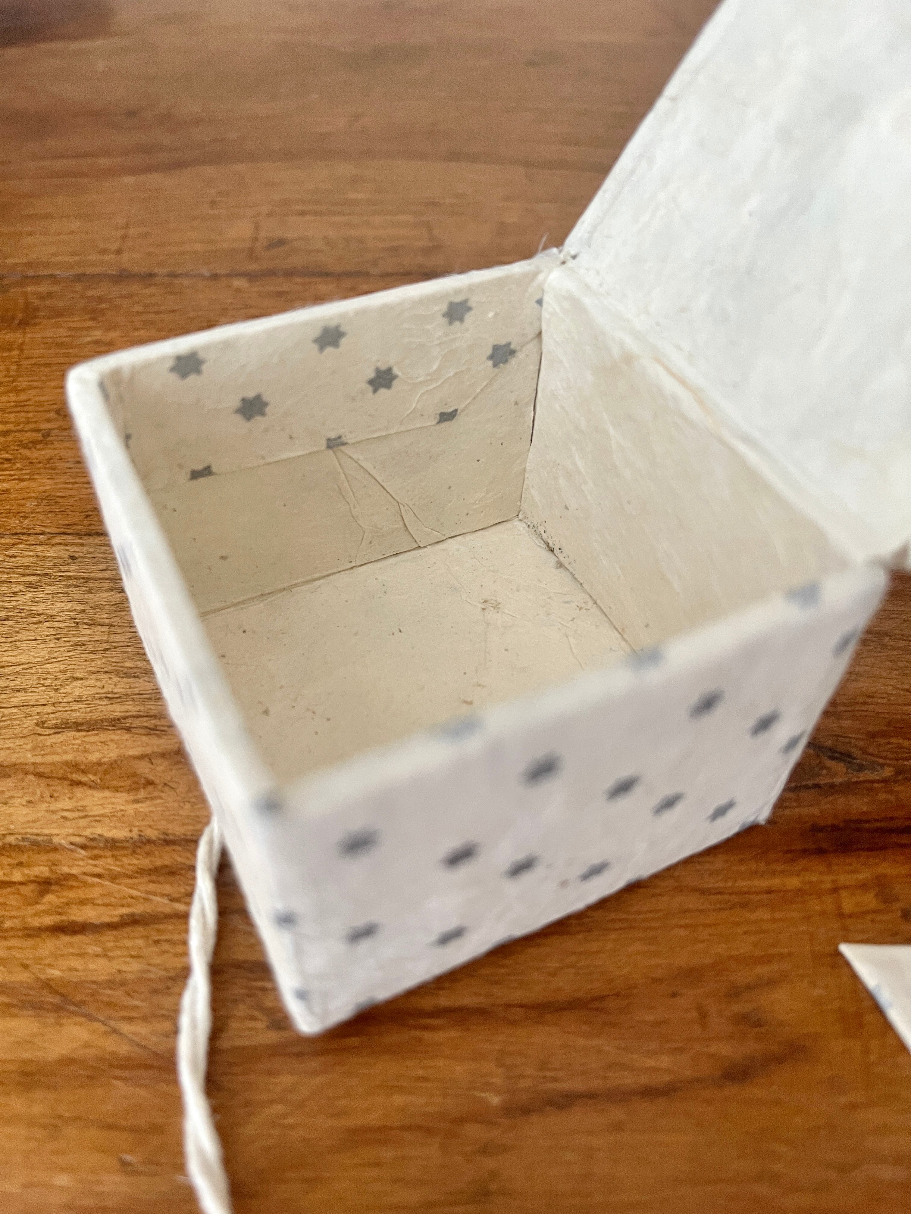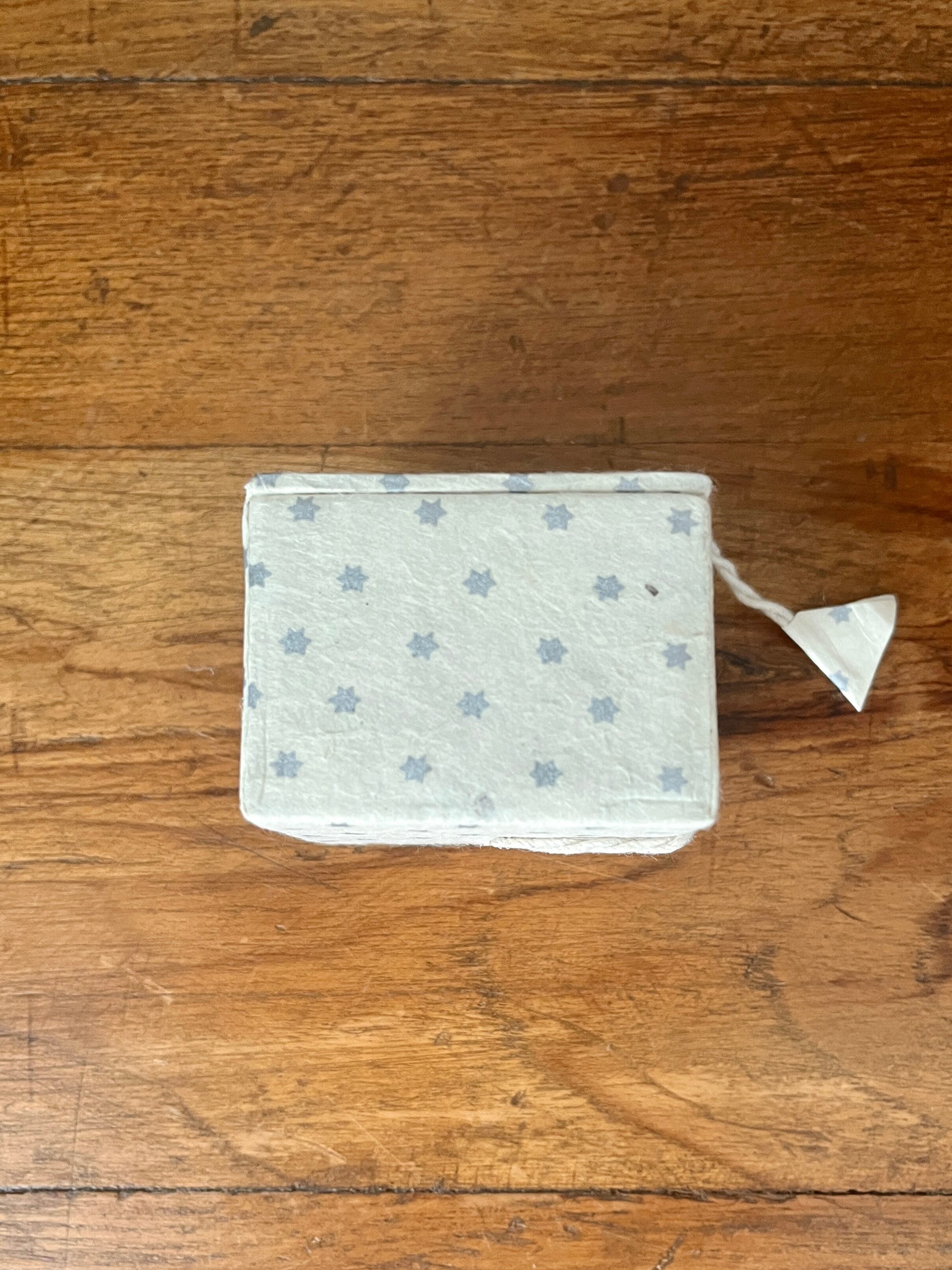 コットン生地を使用したリサイクルペーパーにハンドブロックプリントが施され、しっかりと厚みのある箱に作られています。