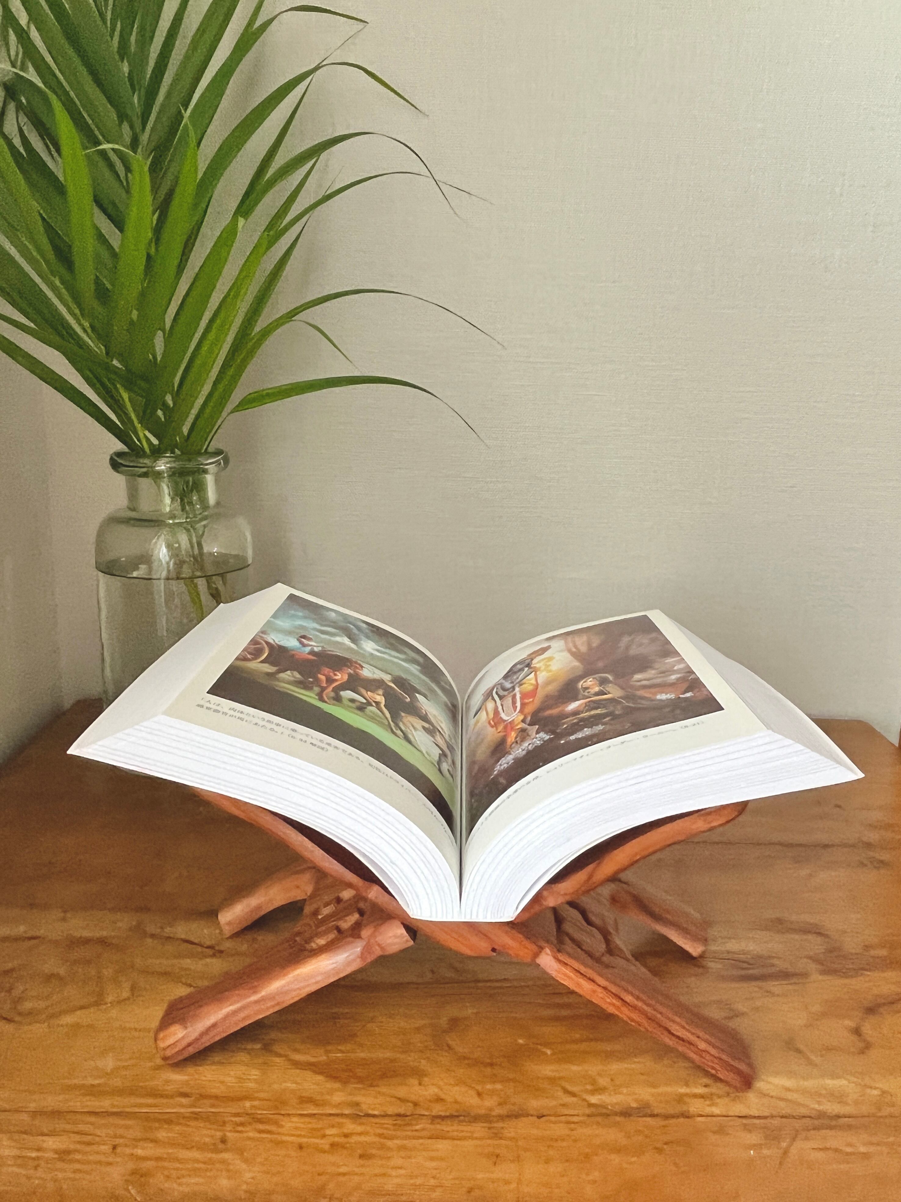 一枚の木材を切り込んで模様が彫られています。継ぎ目なく作られているため、大型本を置いてもしっかりとした安定感があります。